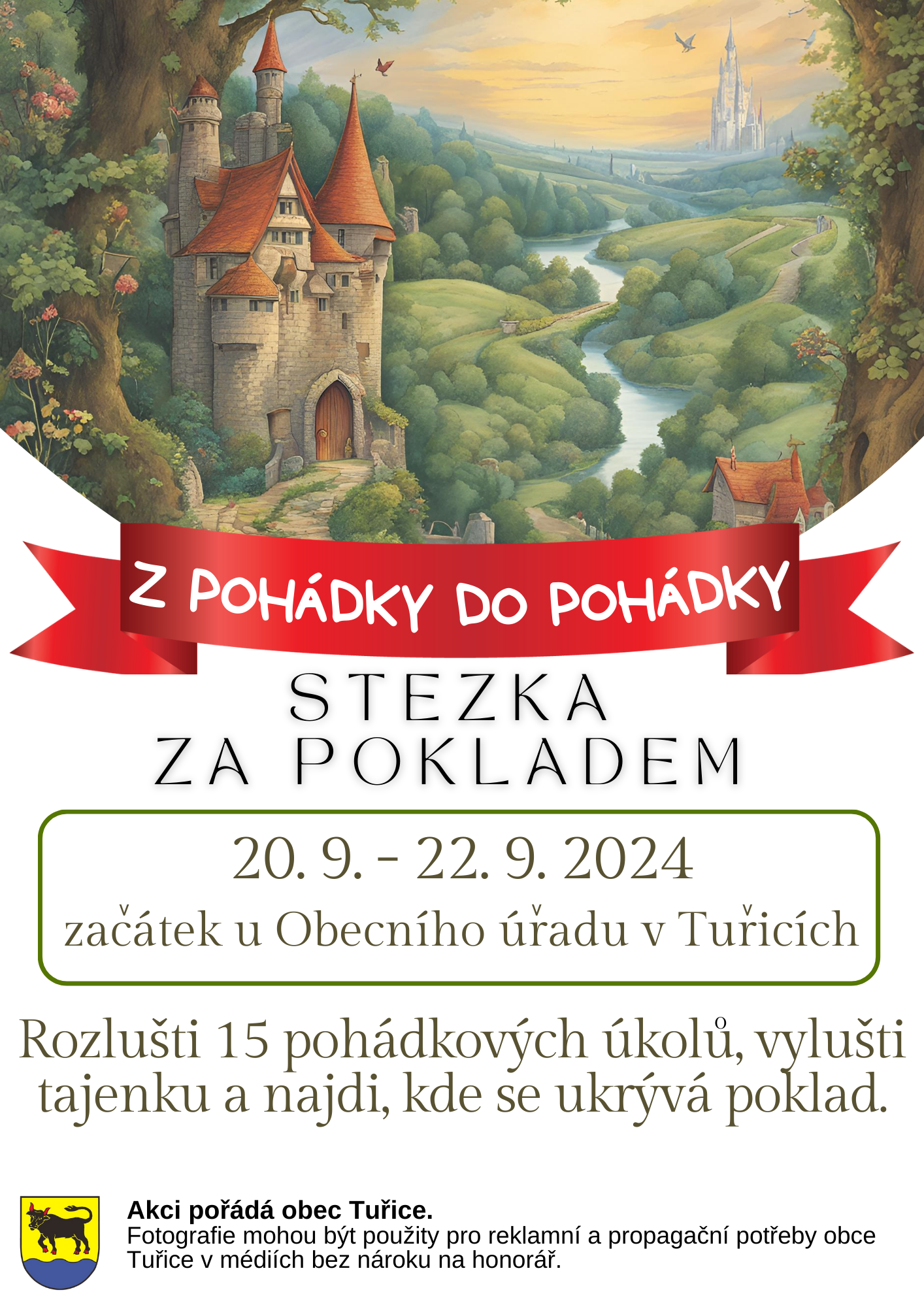 Začátek stezky je u Obecního úřadu Tuřice, kde si vezměte tajenku a tužku (pokud zapomenete vlastní).